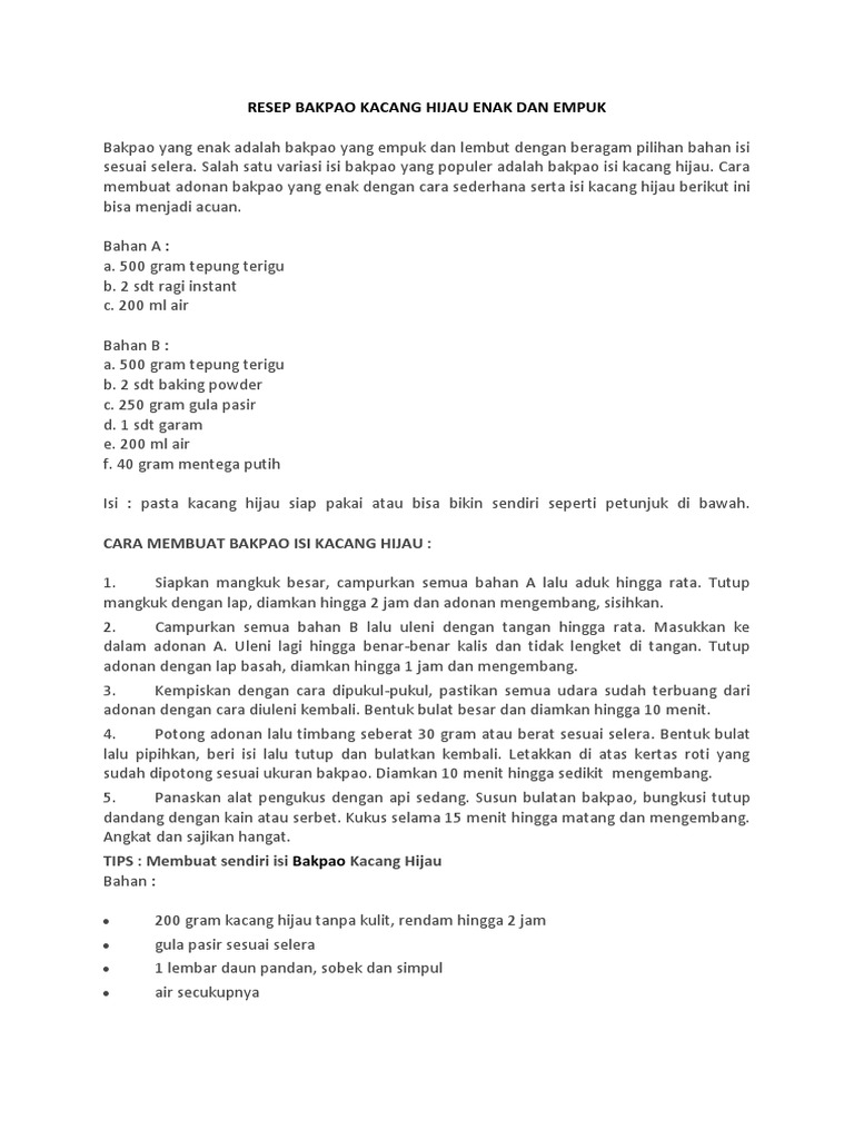 Lihat juga resep pao lembut isi kacang hijau enak enak lainnya. Mari simak resep mudahnya dibawah ini. Sajian ini tentu mudah untuk dibuat. Resep bakpao coklat kukus lembut anti bantet. Jangan lupa rendam kacang hijau.